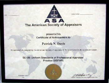 Uniform Standards of Professional Appraisal, USPAP Diploma awarded to Patrick Davis